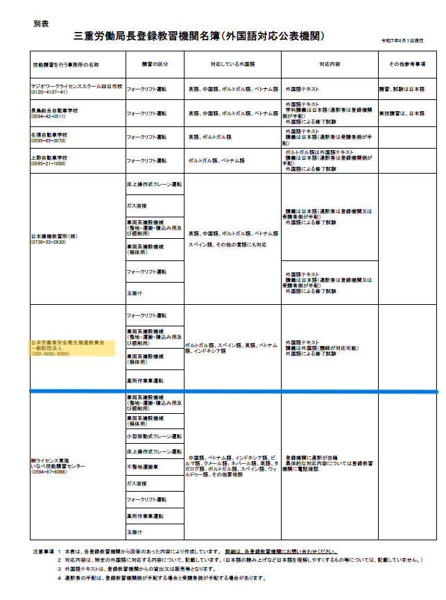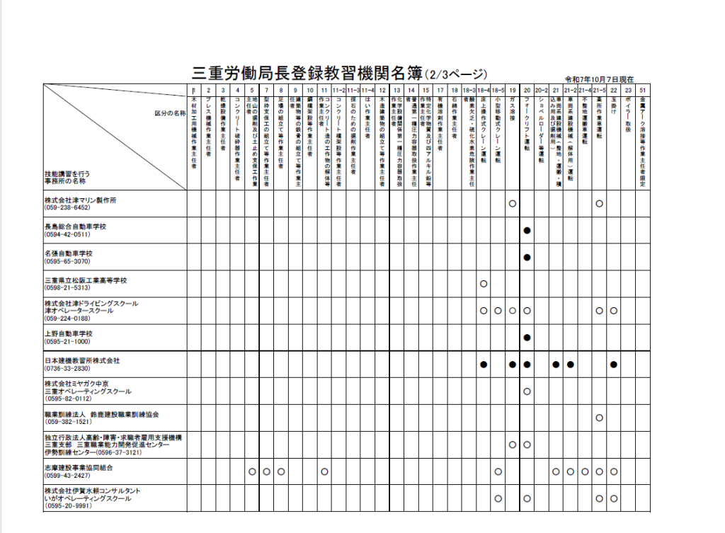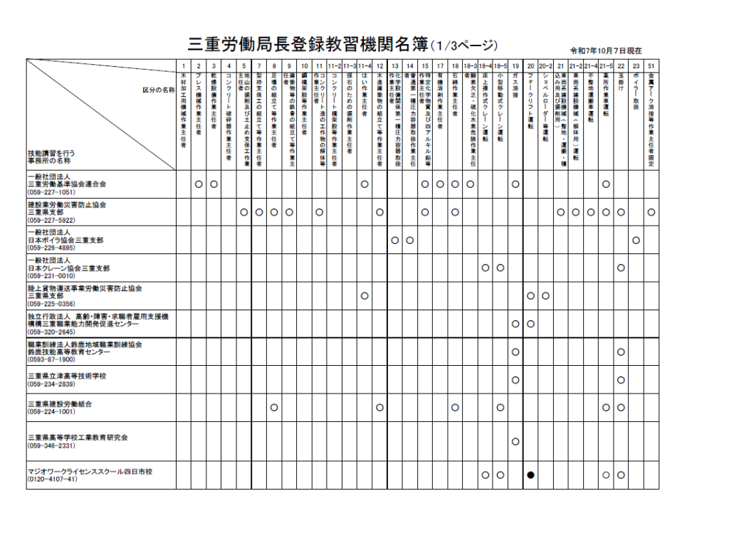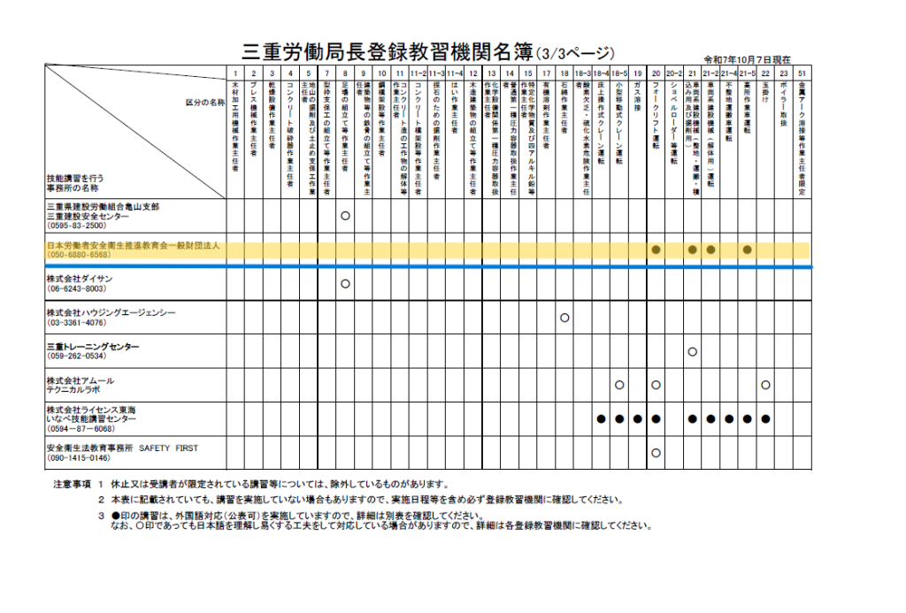 下記は、厚生労働省三重労働局HPにて公表されている三重労働局長登録教習機関名簿(令和7年10月7日現在)です。
